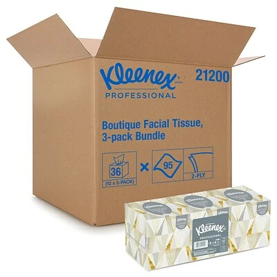 Provide easy access to an office essential with this 36-pack of facial tissue boxes. The two-ply construction absorbs liquids to leave skin dry, and the soft construction offers added comfort. Each box features a low-level alert system to let you know when it’s time to grab another box. With their compact size, these Kleenex Boutique boxes take up minimal desk space.