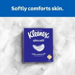 Wipe dripping noses with this facial tissue. Kleenex® Ultra Soft ™ Tissues are indulgent 3-ply tissues that are America’s softest ultra soft tissue* (among national brands). Dependable strength with ultimate softness* (among national brands) make these the best everyday tissues you can get. These Kleenex Ultra Soft facial tissues have a cube-box design for fitting onto small counters.