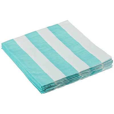 JAM Paperยฎ Aqua Blue Stripe Medium Lunch Napkins add an extra touch of style to your party’s tableware! Their classy hue and smooth texture will make these well-crafted 2-ply paper napkins an instant hit with you and your guests. They measure an even 6 1/2″ x 6 1/2″, providing the perfect size for serving with sandwiches, cake and entrรฉes. They’re also easily disposable, which will save you time from a tiring cleanup at the end of a long night! Each napkin is carefully designed to wipe up any drink or food spills, as well as grease smears on hands and faces.