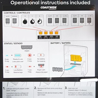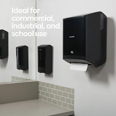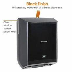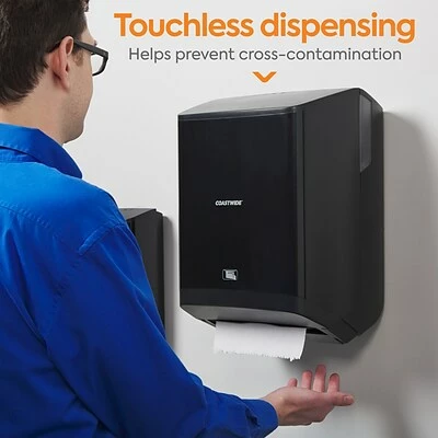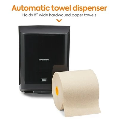 Enable simple hand drying in busy washrooms with this automatic hardwound towel dispenser. The sheet length, sensor distance and delay time are adjustable to make an 800-foot J-Series hardwound towel roll last longer, and the touch-free motion-activated operation helps prevent cross-contamination. This high-capacity Coastwide Professional™ J-Series electronic hardwound towel dispenser boasts color-coded interior touchpoints, so janitorial staff can quickly locate and access touch points for reloading and is engineered to work with J-Series hardwound towel.