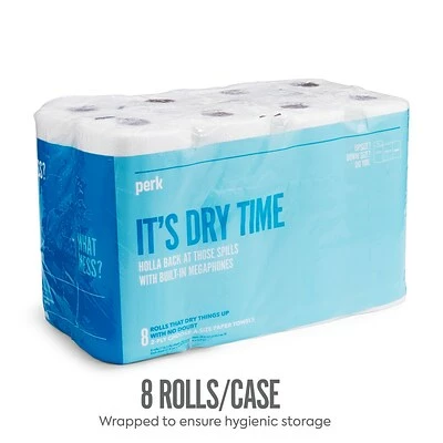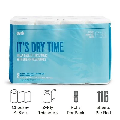 Holla back at spills on break room countertops with these thirsty white paper towels. Eight rolls in each pack deliver serious drying with no doubt, and just-my-size perforations reduce the overuse by providing a sheet made for every mess. With two-ply construction that soaks up each and every spill, these Perk™ Choose-A-Size perforated paper towels make messes a memory.