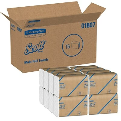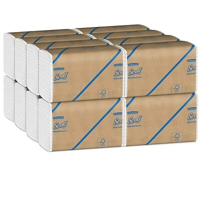 Keep hands and counters dry with these Scott multifold paper towels. The absorbent material soaks up liquids quickly, and the soft texture offers added comfort when drying hands. The uniquely folded design helps reduce paper waste and fits neatly in select dispensers, keeping towels off restroom and kitchen counters. Each pack in this case contains 250 individual paper towels, making it easy to distribute an ample supply to multiple restrooms in your building. Featuring a crisp white color, these Scott multifold paper towels lend a professional look to your workplace.
