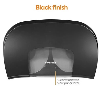 Store two rolls of toilet paper simultaneously for reduced maintenance with this black jumbo bath tissue dispenser. Compatibility with various 9″ jumbo-sized rolls with a 3.5″ core offers easy replacement, and the wall-mounted design allows flexible placement. This Coastwide Professional™ twin jumbo bath tissue dispenser features a black finish for a modern, professional look, while the included installation hardware and dispenser key allow for simple setup and quick access.